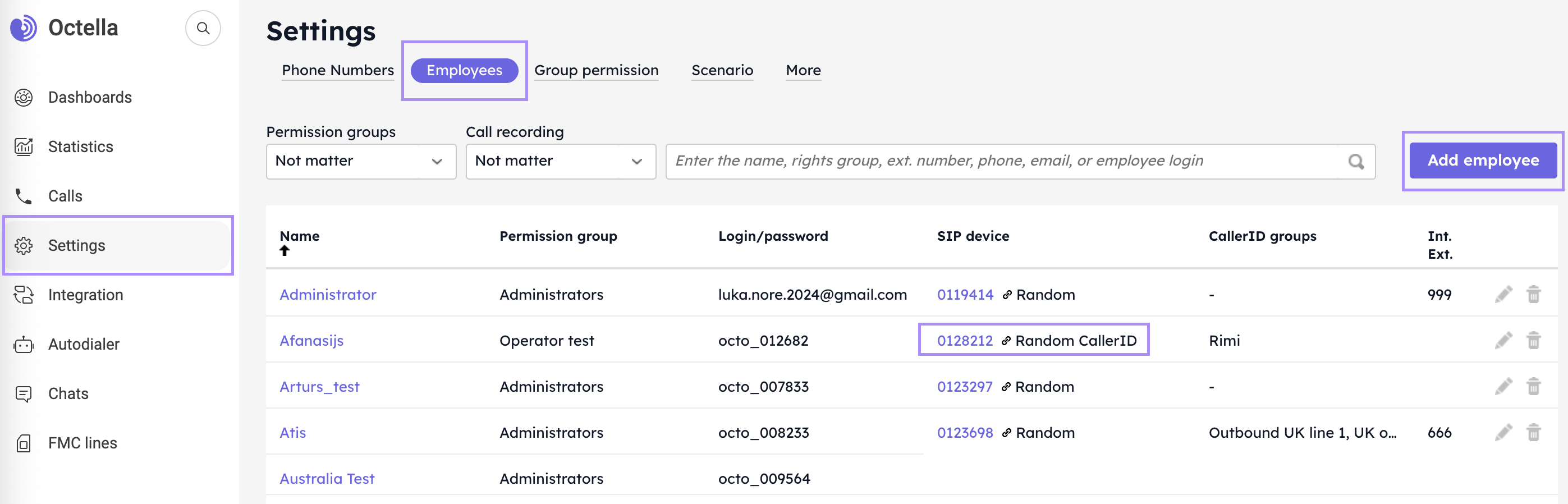 For proper use of CallerID groups please adjust SIP device settings in Employees section to Random CallerID.