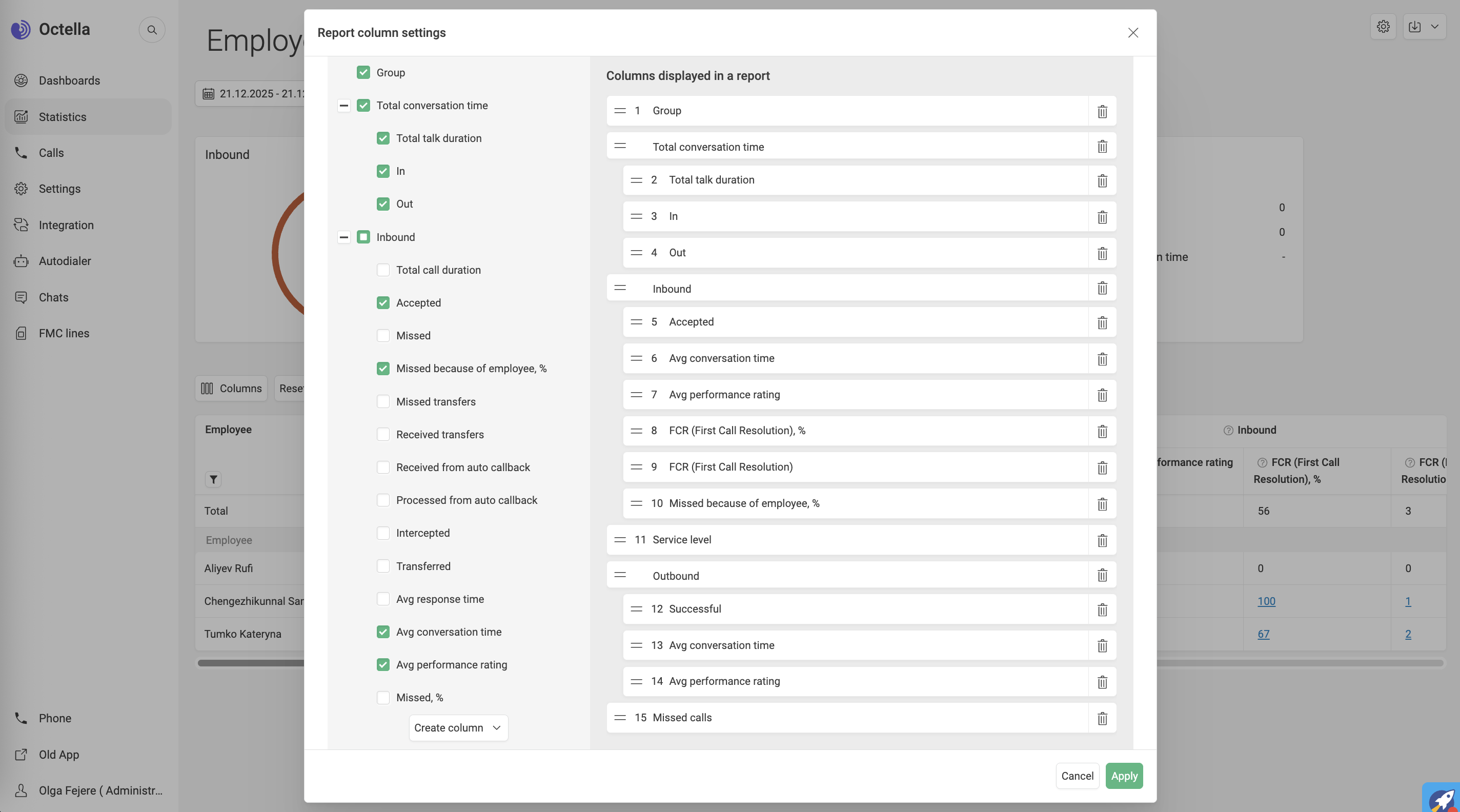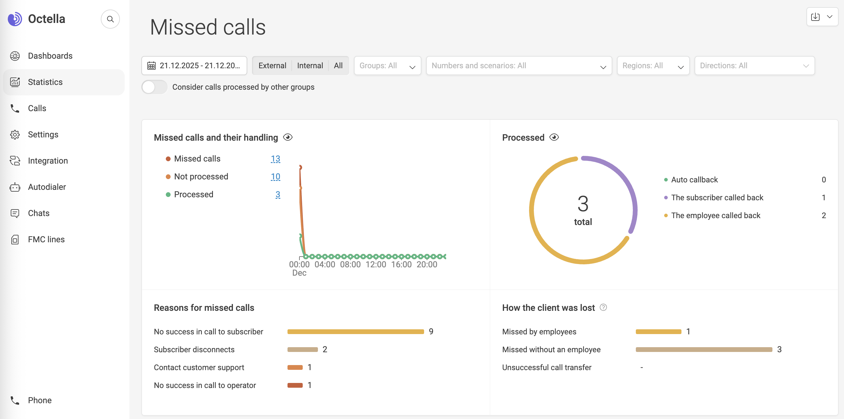 Octella has pre-built Dashboards to easy follow up the missed call dynamics. Various filters can be applied to track: