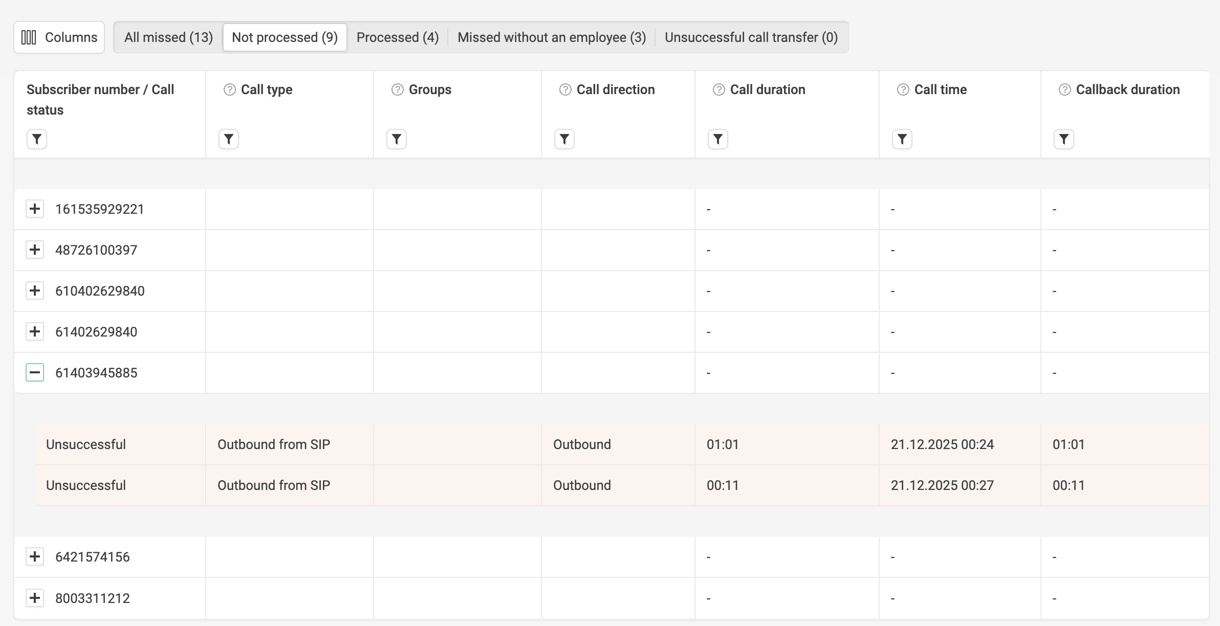By clicking on each of the metrics (missed / not processed / processed), the chosen call data will be displayed.