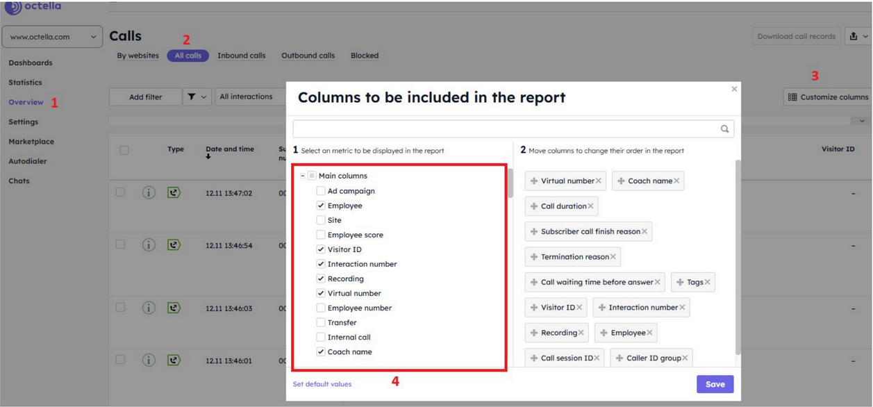 Information based on the specified parameters is displayed in a table: one row = one call, with the call parameters displayed in columns. To configure the columns you want to display, use the “Configure columns” button: